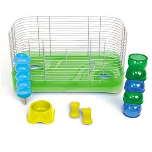 - Includes cage, floor, tunnel, bottle, bowl and clips